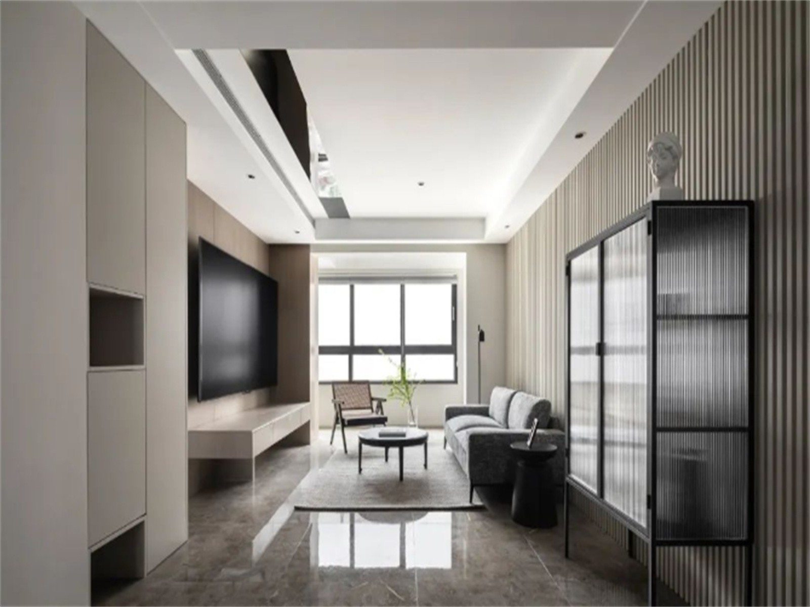 沙发背景墙以长城板装饰,利落线条让空间更有层次,沙发和小几均为矮脚设计,拉低视线,突显层高,长虹玻璃斗柜可做展示柜,纯净玻璃让居室多些清爽感
