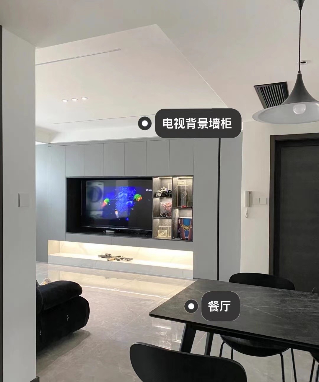 客厅的电视背景墙柜设计,电视嵌入到柜子当中。对于小户型来说,这样的电视背景墙非常实用,可以让家里多出很多的储物空间。