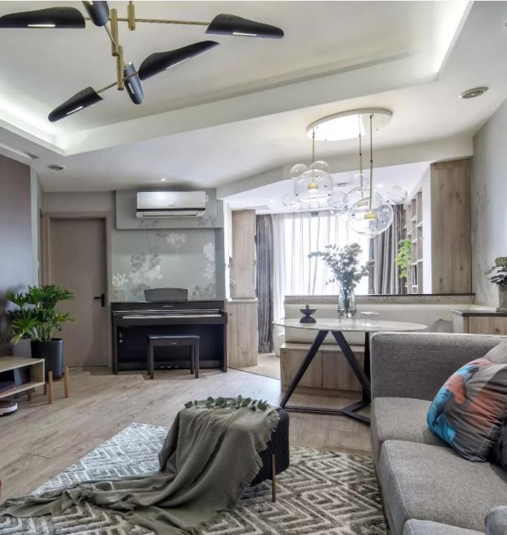 客厅不规则的墙面留出了钢琴的位置,闲暇时时还可以弹奏一曲。