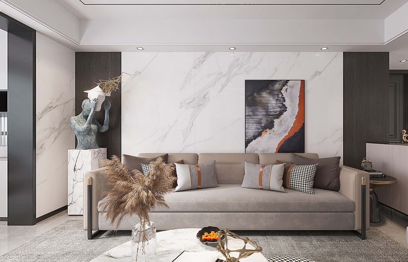 过道内嵌了一组定制柜,采用了和沙发背景墙的同色木饰面,形成统一