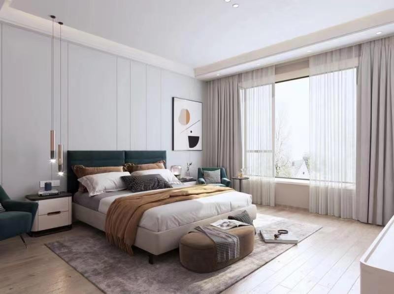 客厅设计效果 1,哑光鱼肚白岩板电视背景墙,高端大气。 2,四周吊顶,中间无吊顶,空间开场大气。 3,玻璃楼梯扶手通透,呈现楼梯的立体雕塑之美。 4,茶桌侧面设水吧,方便烹茶。