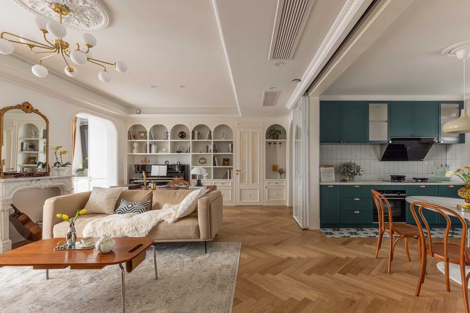 无论是拱门还是柜体开架,拱形线条延伸至整个空间,线条层次丰富、起伏变换