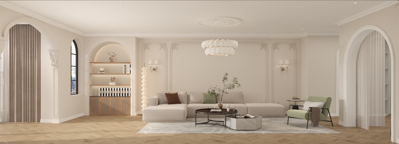 整体风格为法式现代,没有太过复杂的装饰线条,但是也没有完全取消。地面人字拼地板通铺