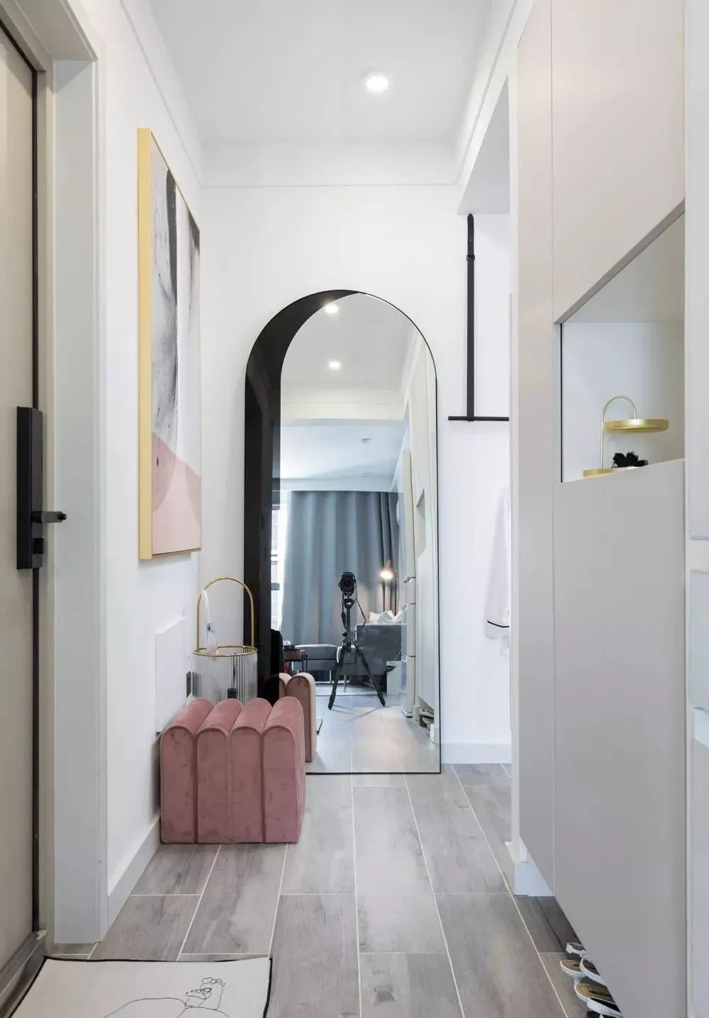 玄关,在进门正对面定制嵌入式的玄关柜,足够收纳一年四季所有的鞋子。