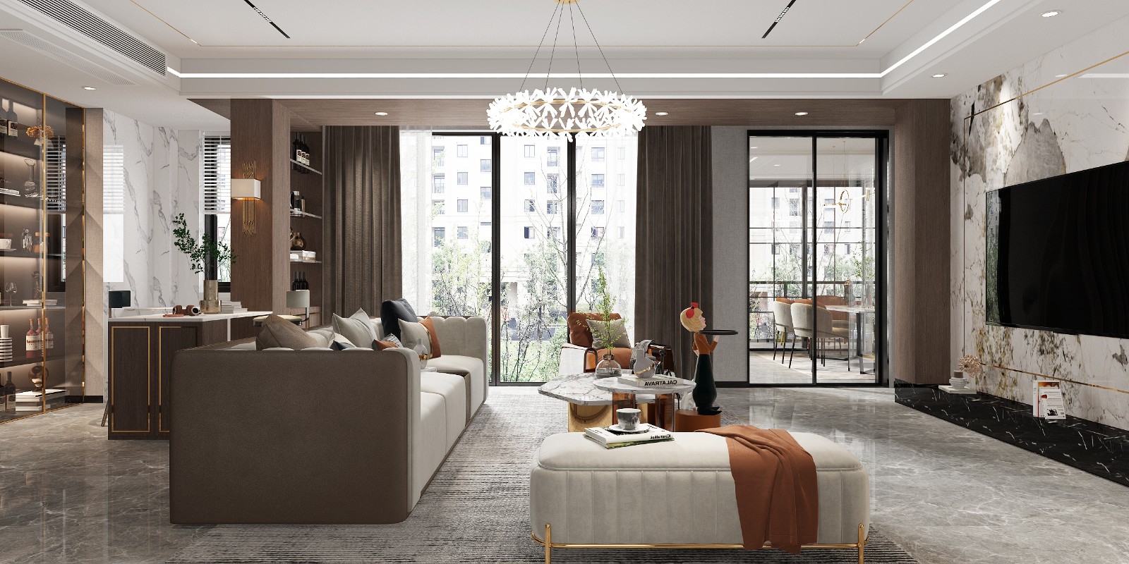 客厅整体采用带有***灰质感的中性色,减少不必要的隔间和建材堆砌,营造一种精致不失优雅的居家空间。