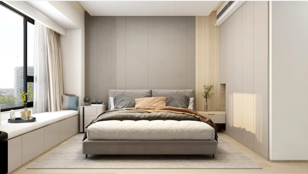 卧室背景墙,灰搭配原木风,床为现代灰度