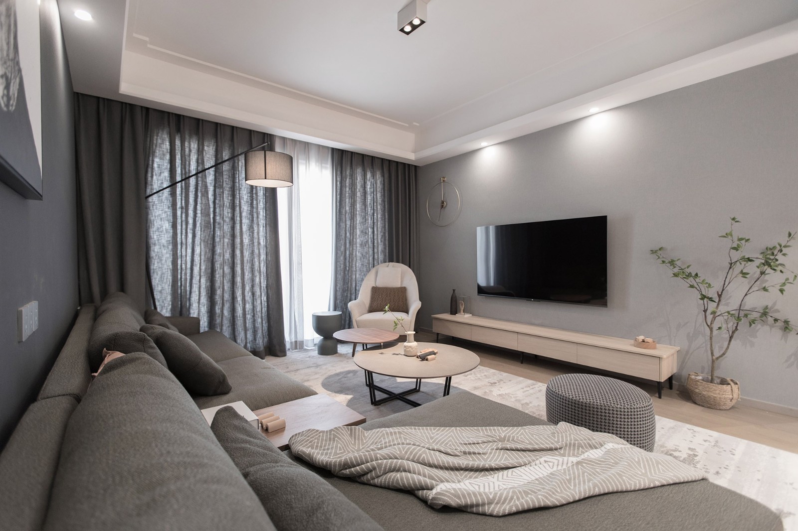 将摩登气质刻入整体基调 从面到体,阐述纯色之美 使跳色与细纹 唤活了客厅的生活仪式感