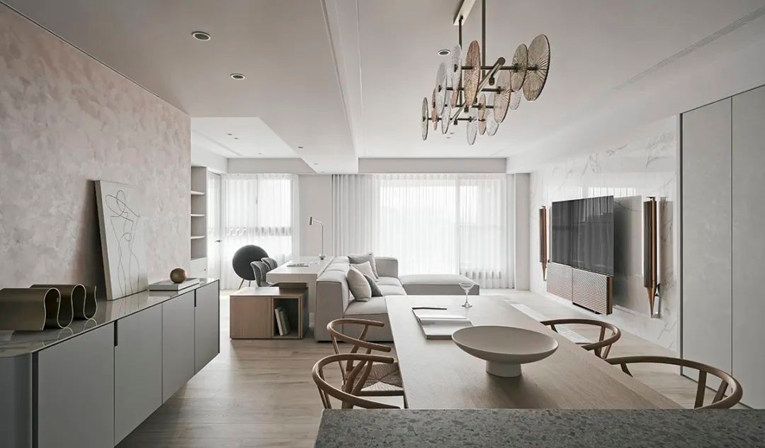 开放式书房就安排在了沙发后,所以书房上的色调保持统一,中性色的简朴一贯到底。