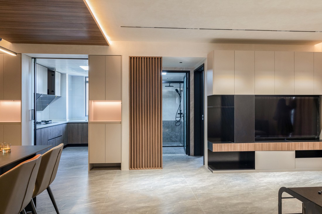 餐厅顶面为木质悬浮吊顶,搭配无框小射灯和嵌入式灯带,温馨的用餐氛围在空间自然流淌。