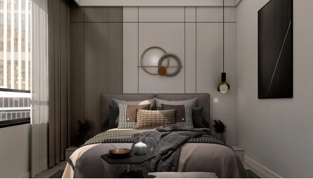 卧室背景墙,硬包背景,墙面白色乳胶漆搭配极简挂画