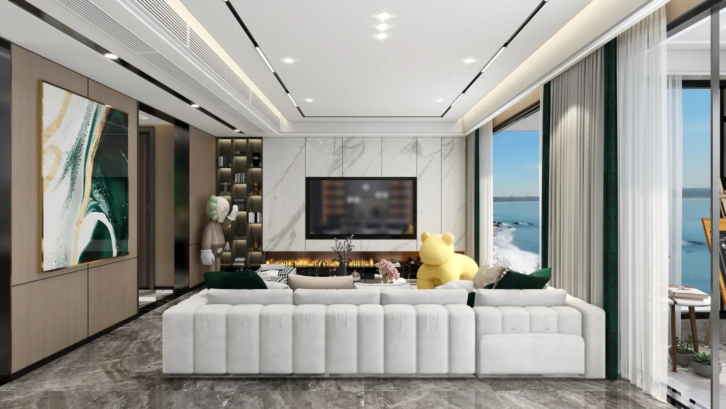电视机平滑地嵌入墙面,与跳跃的白色沙发相望,看见充满魅力的生命的深度。