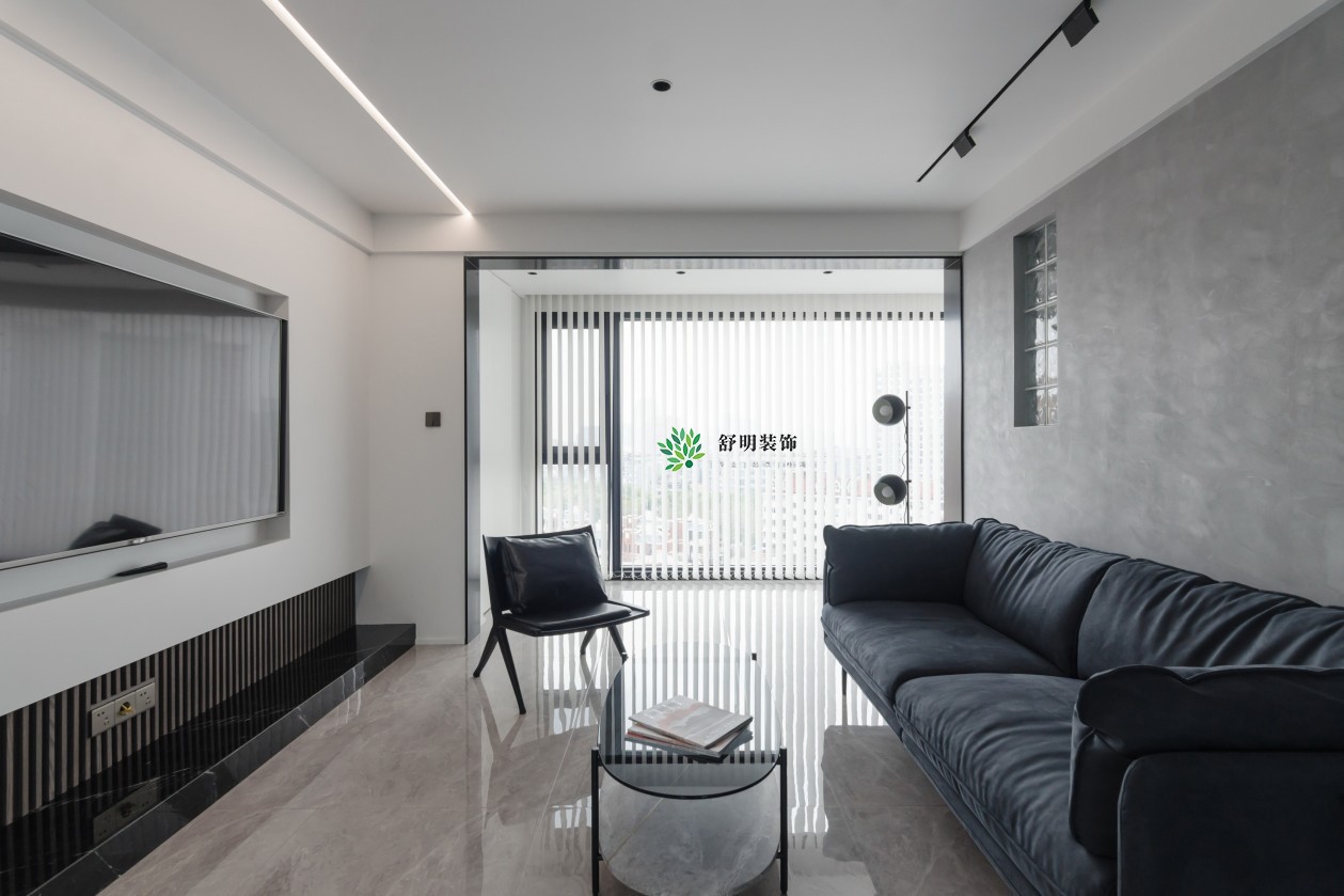 客厅视角,沙发后面深色的木饰面延伸至走廊,左侧采用灰***术漆形成粗犷肌理感