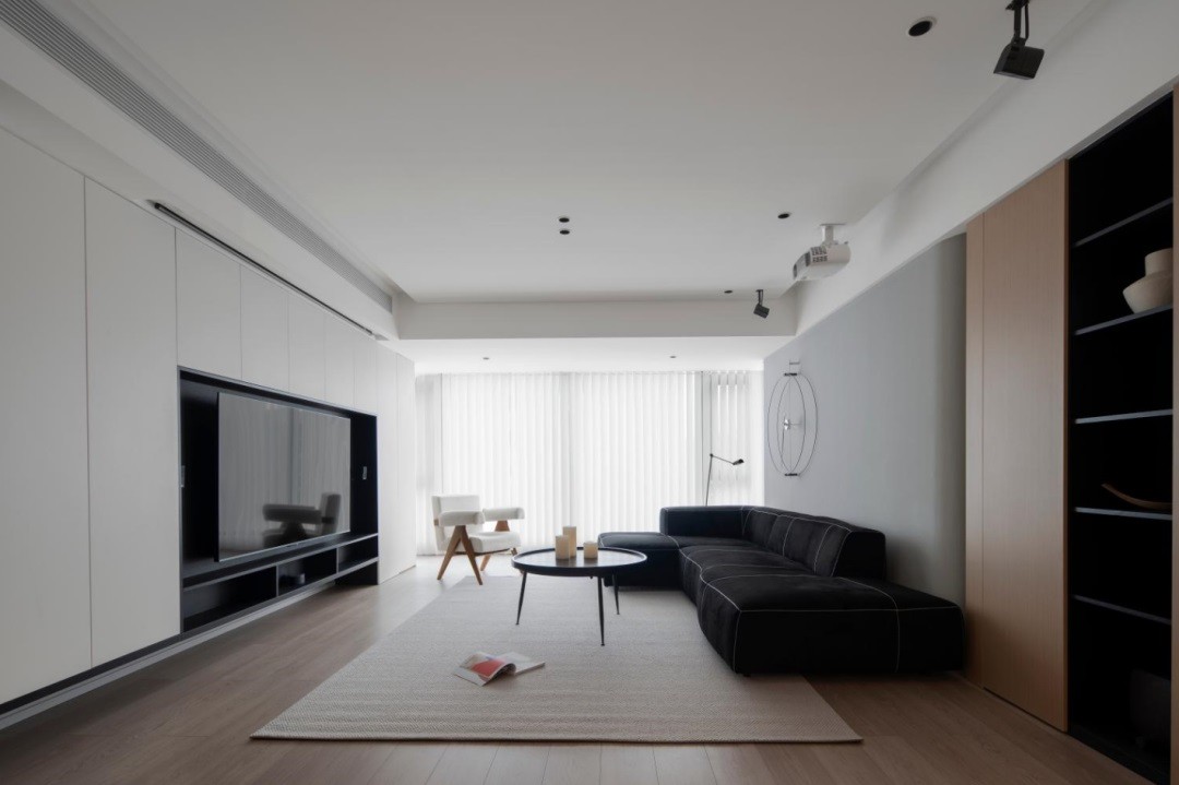 由于原本户型动线不合理,使得卧室在进门左手边,设计师将房间门替换成隐形门,并且改变开门位置,形成内玄关,提高了房间整体的收纳能力,兼具美观感、神秘感的同时,也增强了进门纵深感。