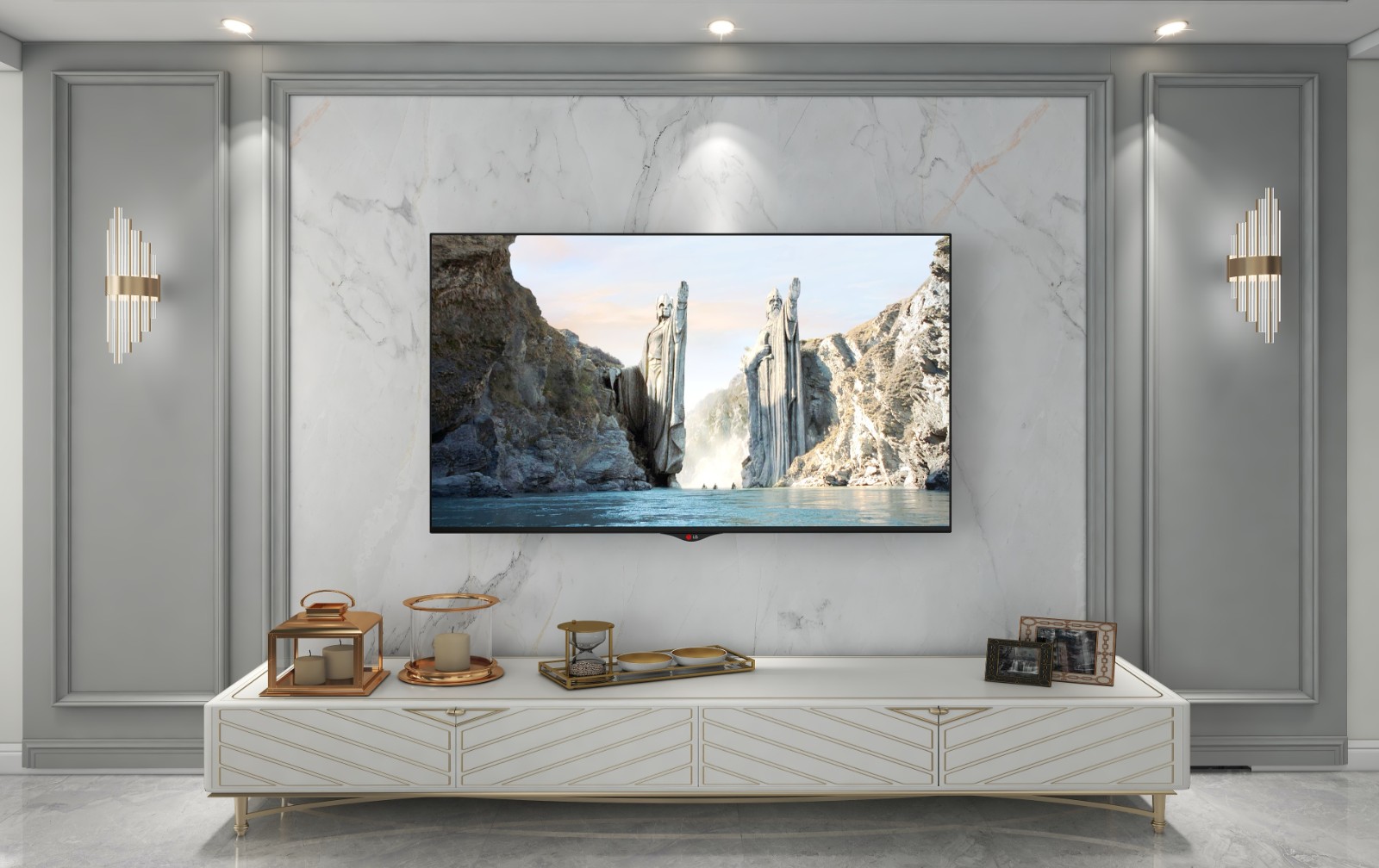 用对称的手法加石纹岩板,以灯光烘托氛围的方式让整个电视墙看起来***且优雅。
