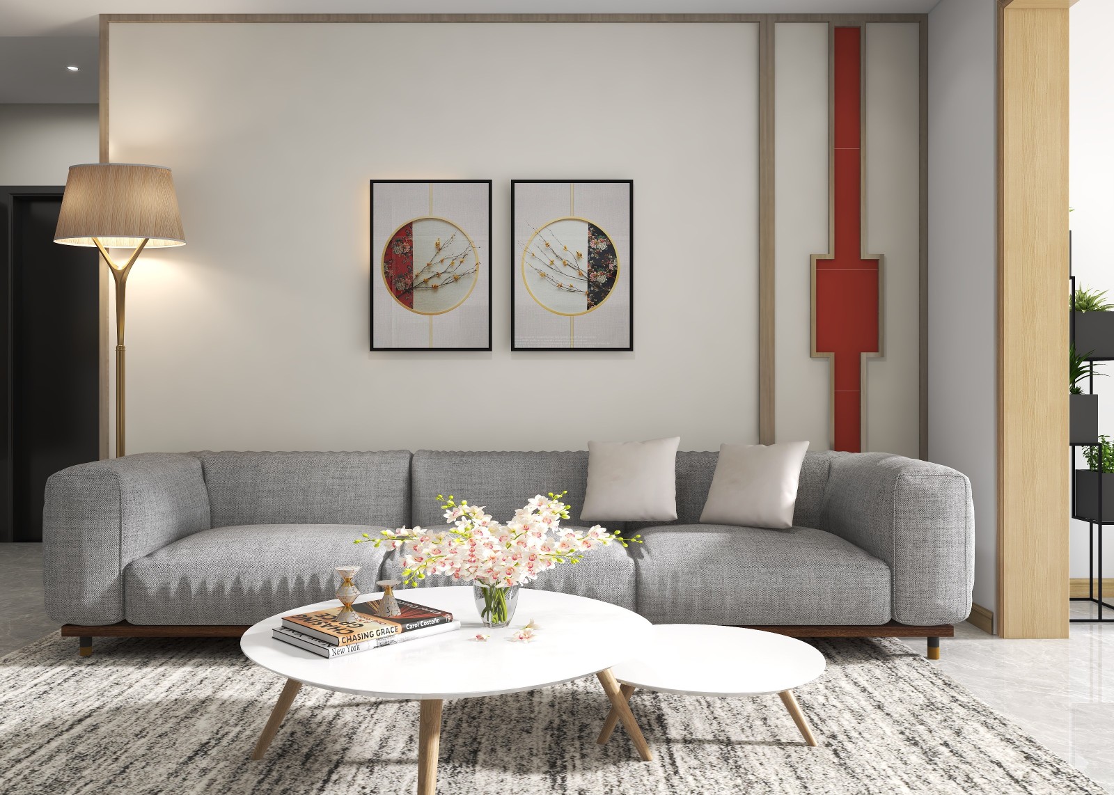 大量运用中式元素又结合现代风格,右边用墙饰面与红色乳胶漆结合,把空间点缀起来使得不那么枯燥。