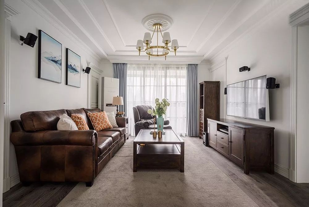 白色电视墙简洁而沉稳,深木色电视柜和边柜典雅大气,充满了美式风情。茶几上摆上一瓶鲜花和金属装饰物,给整个空间增添了几分清新与内涵。
