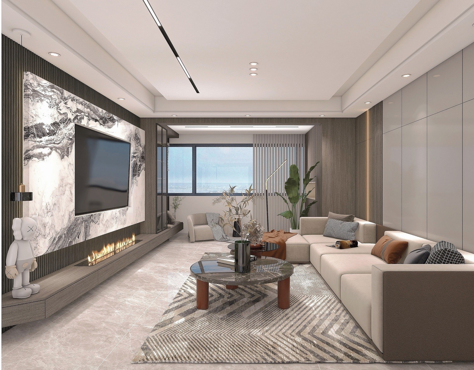 墙板与岩板结合的背景墙更显时尚,玻璃柜门的立柜为业主的展示停供空间