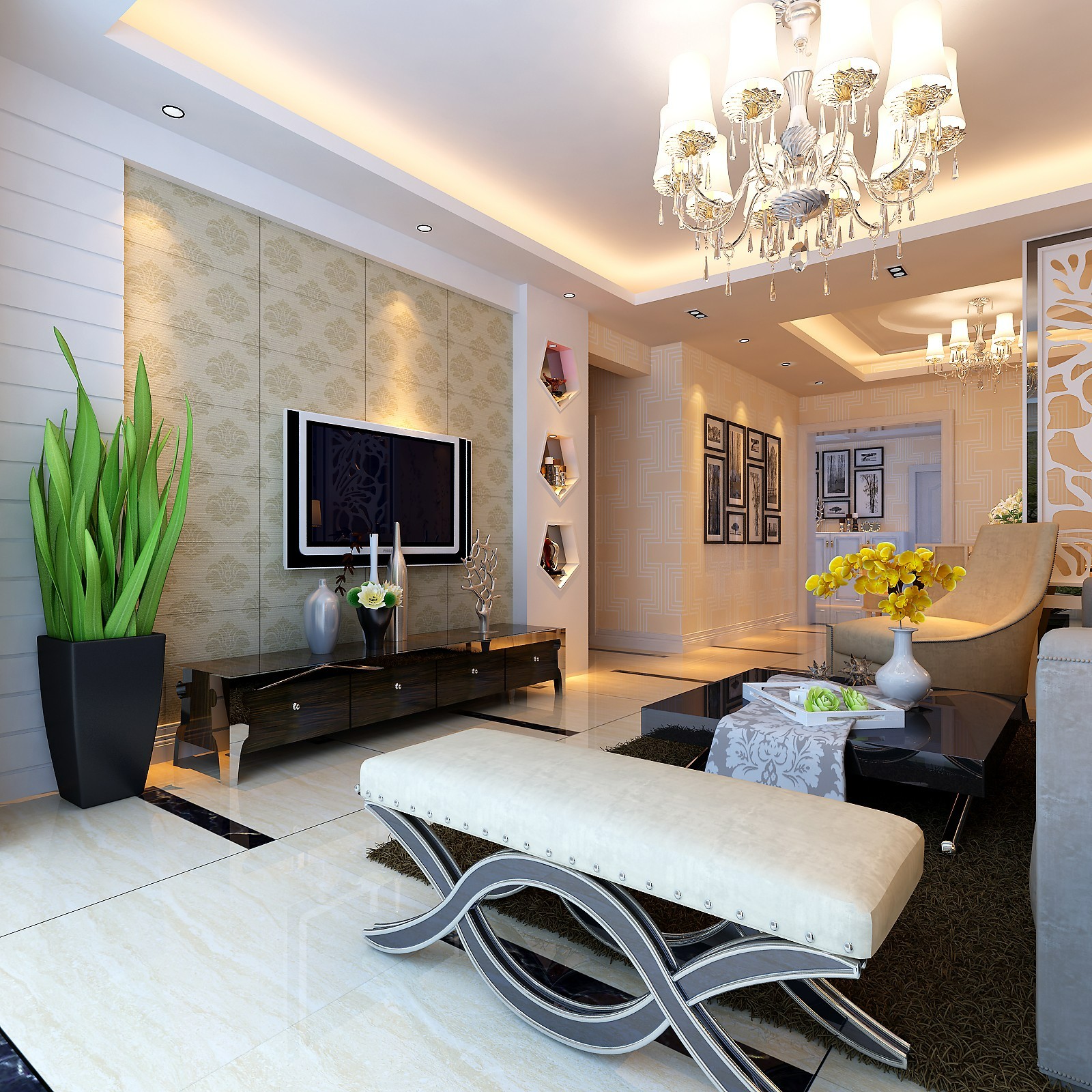 客厅展示:房间大部分采用壁纸作为颜色的基调搭配,主要以暖色系为主。