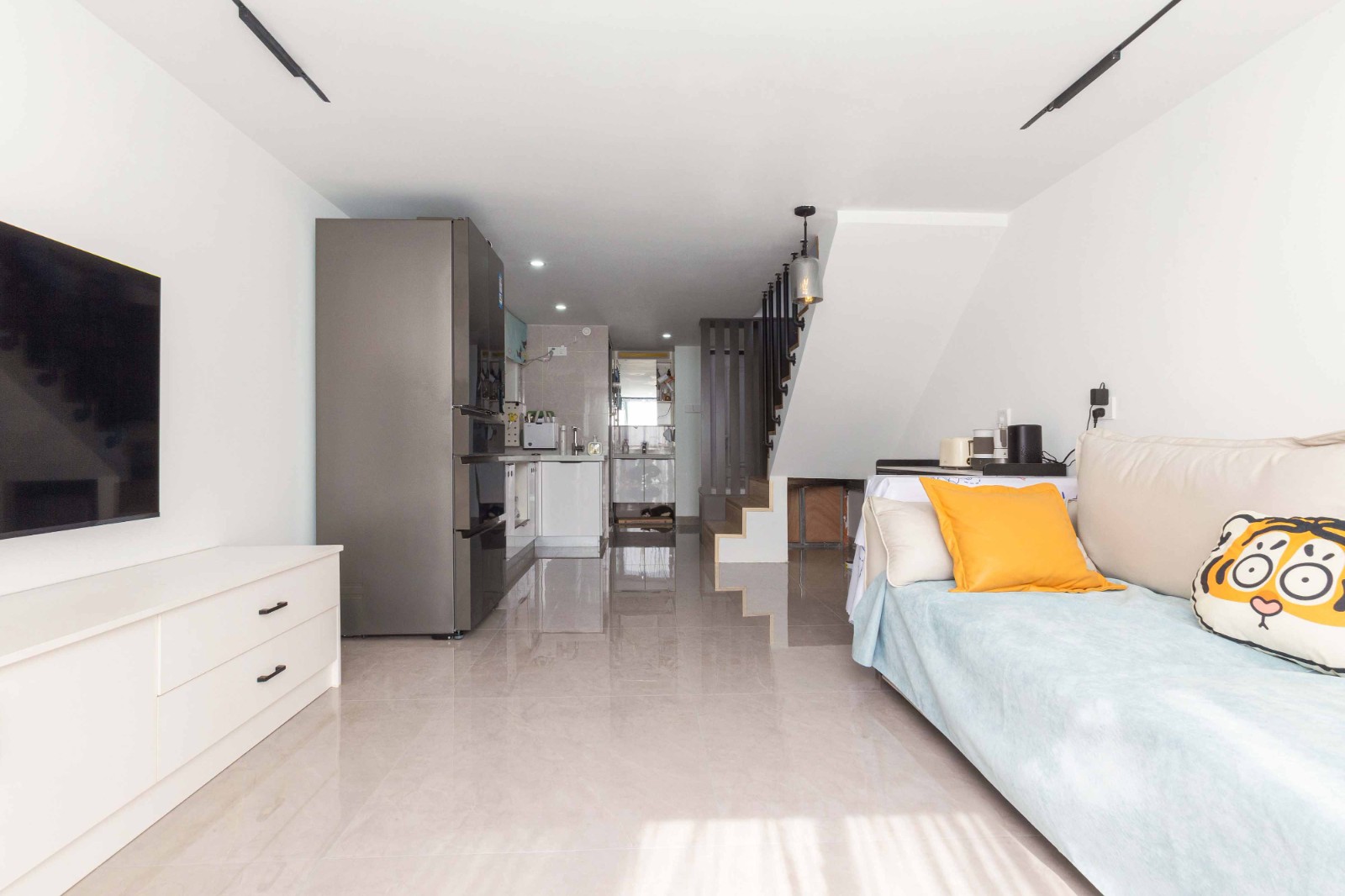 这是屋子的一个大概效果,一层起居室,二层是卧室,进门右手边依次是卫生间和厨房,全屋大白墙,楼上楼下两种格调,满满的氛围感,好舒服! 屋主并没有去定义房子的风格,只是想把自己喜欢的一切都装进房子里,就已经很满足了。