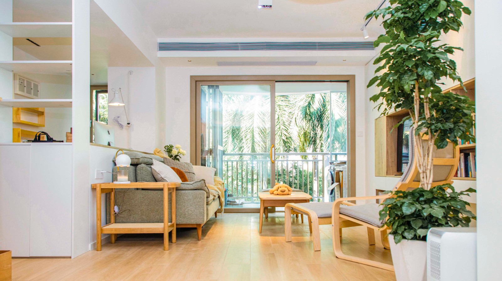 客厅以浅淡的白色和木色,搭配简单的布艺沙发,开放明亮、文艺清新。