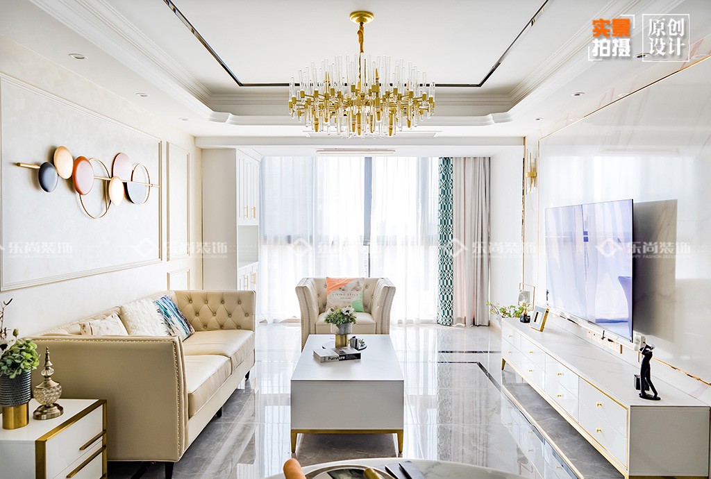 客厅整体采用明快的浅色调,充分应用皮革、石材、金属等元素进行搭配,通过水晶吊灯与射灯、壁灯的组合,营造出精美而温馨的居家色彩。