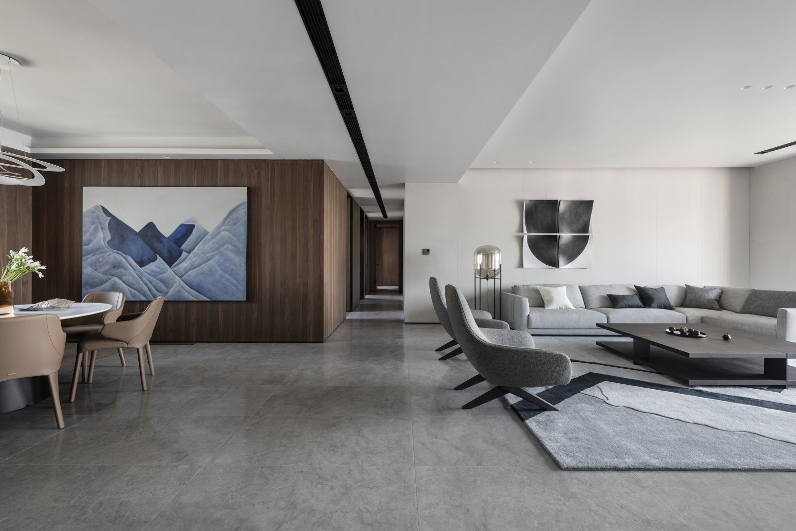 客厅被落地窗包围,室内与室外“隔窗而望”,建立起亲密的联结,空间架构更有灵性和通透感。光影在室外穿行,又在客厅里交叠,明暗错落之间大理石地面反射起锃亮的光,营造无处不在的光线美。