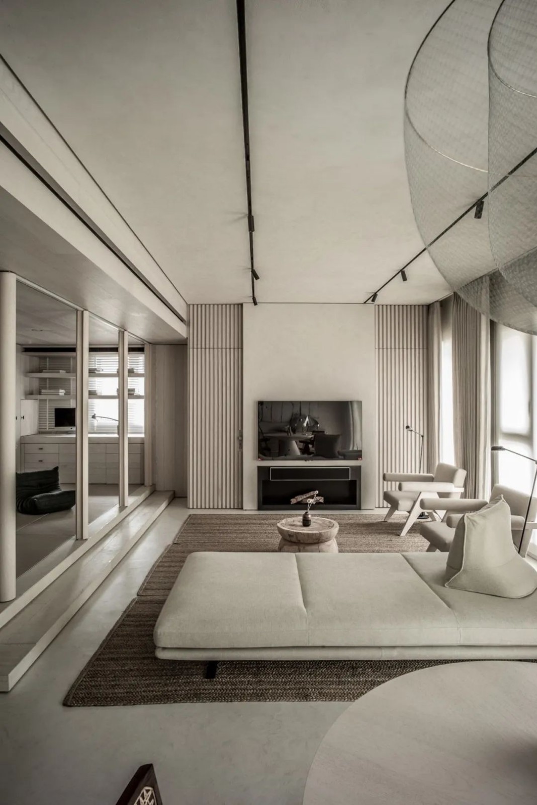 宋之美,形而上至诗词歌赋,形而下至器具用物,在这间雅室中一一体现,完美地满足了屋主对古人生活的想象。主卧入口处做了两级台阶,将整体空间上抬,营造一种仪式感。古代的光源多是来自立于地面的烛火和悬于屋顶的灯笼,设计师希望借鉴这两种灯光布局,使室内充满暖意和温馨。