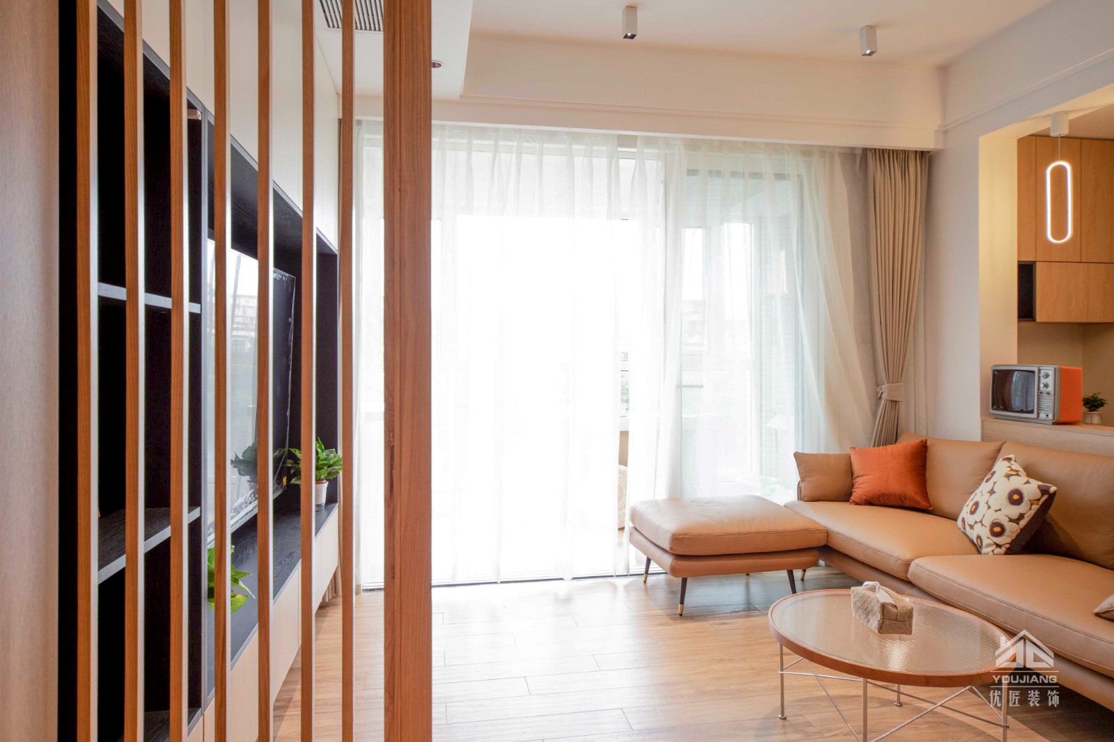 全屋地面选择好打理兼具温暖质感的木纹砖,透过纱帘的光让室内充满明亮,窗帘同时又保障了室内的私密感。