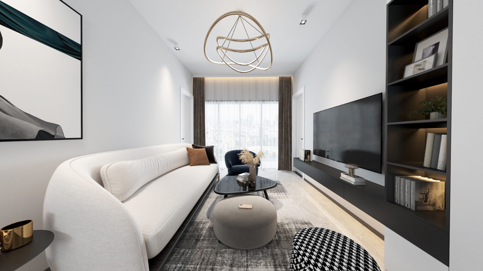 本案是以现代简约风格为主,原户型格局是两房一厅,设计增加一间客房,将洗手台外置于过道,提高空间利用率