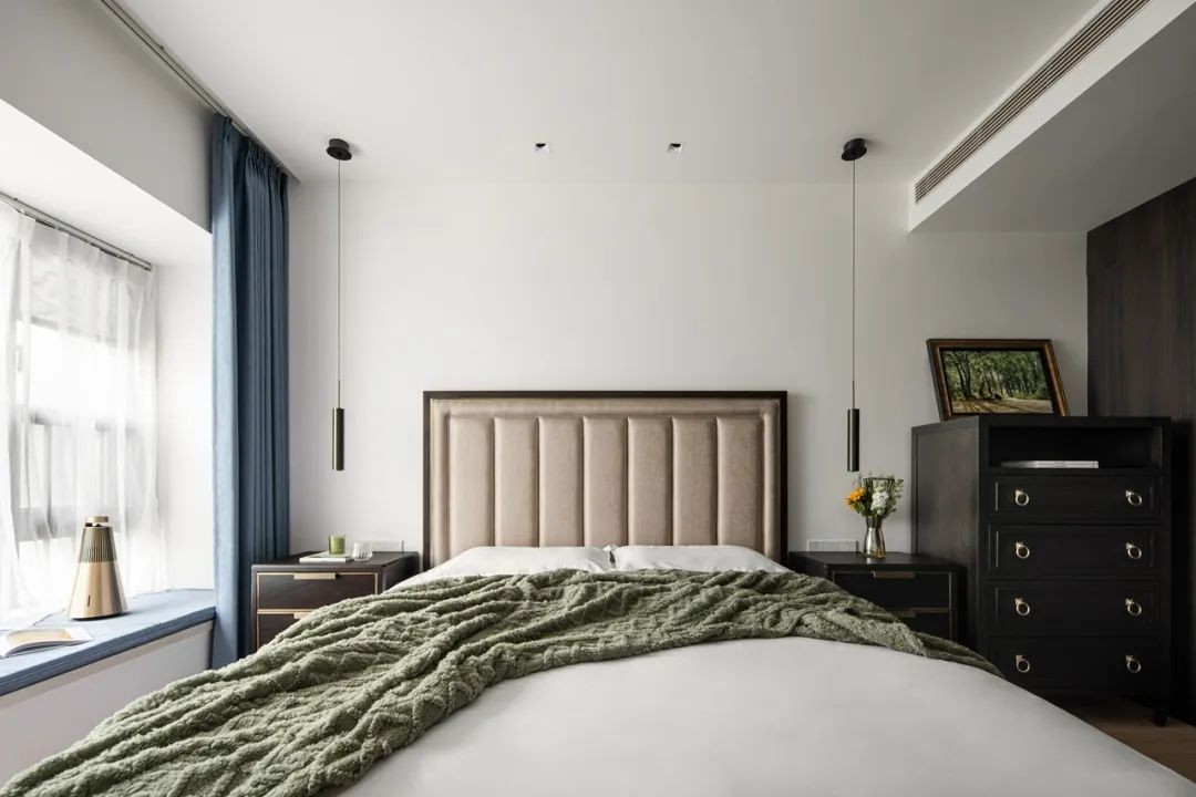 让设计回归生活本质,剔除多余装饰,用安静的力量感知设计本身,所以在休憩空间的塑造上,我们嵌入瓦尔登湖黄昏的温柔与徐缓于室内。以白色为主色调,辅以大地色、湖蓝为点缀,营造一番宁静淡然的氛围。浅灰色肤感衣柜与蓝色沙发椅,在飘窗阳光的照射下,带来温柔的包裹感。空间线条利落,无需多余的装饰,让人褪去浮华,享受休憩时光,归于宁静。