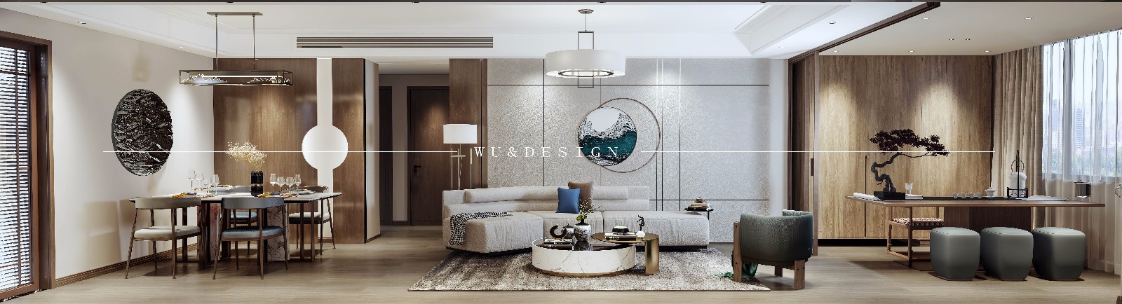 客厅以东方传统文化内涵为设计元素,去掉传统中式的繁复细节,运用带有历史韵味的装饰符号,以现代简约的造型艺术,舒适、自然地发挥东方味道,诠释东方神韵,通过简洁、大方的造型营造出富有生命力和文化内涵的艺术空间。
