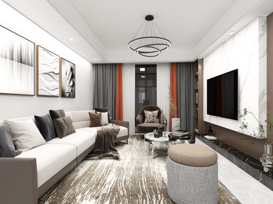 客厅整体看上去显轻奢,极简的线条灯让空间更有层次;橘色窗帘点亮整个空间,让空间更显活力。