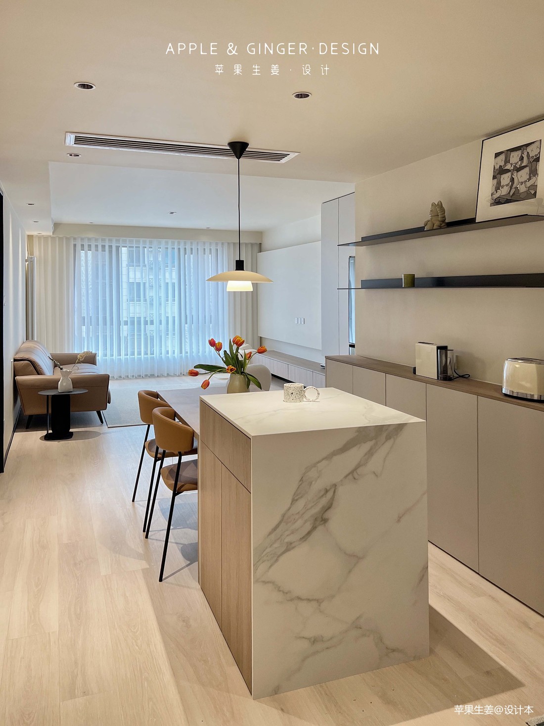 餐厅主要构成为餐桌拼接中岛茶台与吧台,餐桌、座椅颜色上与客厅沙发相呼应,中间吊灯增添就餐时的浪漫与温暖,中岛茶台可以用于调制饮品还可以在回屋时暂时存放做菜原料,下方是储物柜,可以存放碗筷茶杯等玻璃制品。