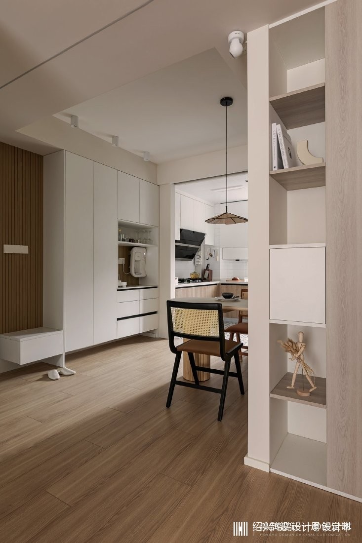 原始户型没有玄关,所以我们把进门功能区规划至餐厅一侧。多功能柜体集合了换鞋卡座、鞋帽收纳柜、餐边柜的功能。整个柜子做了挑空的设计,视觉上更加轻薄灵动。餐边柜分为上中下三层分区设计,底部三层抽屉柜收纳小件餐具,中部开架放置了直饮机与杯具,顶部柜子用于放置不常用的囤货类物品,用分层收纳的方式真正做到了收纳合理有致。