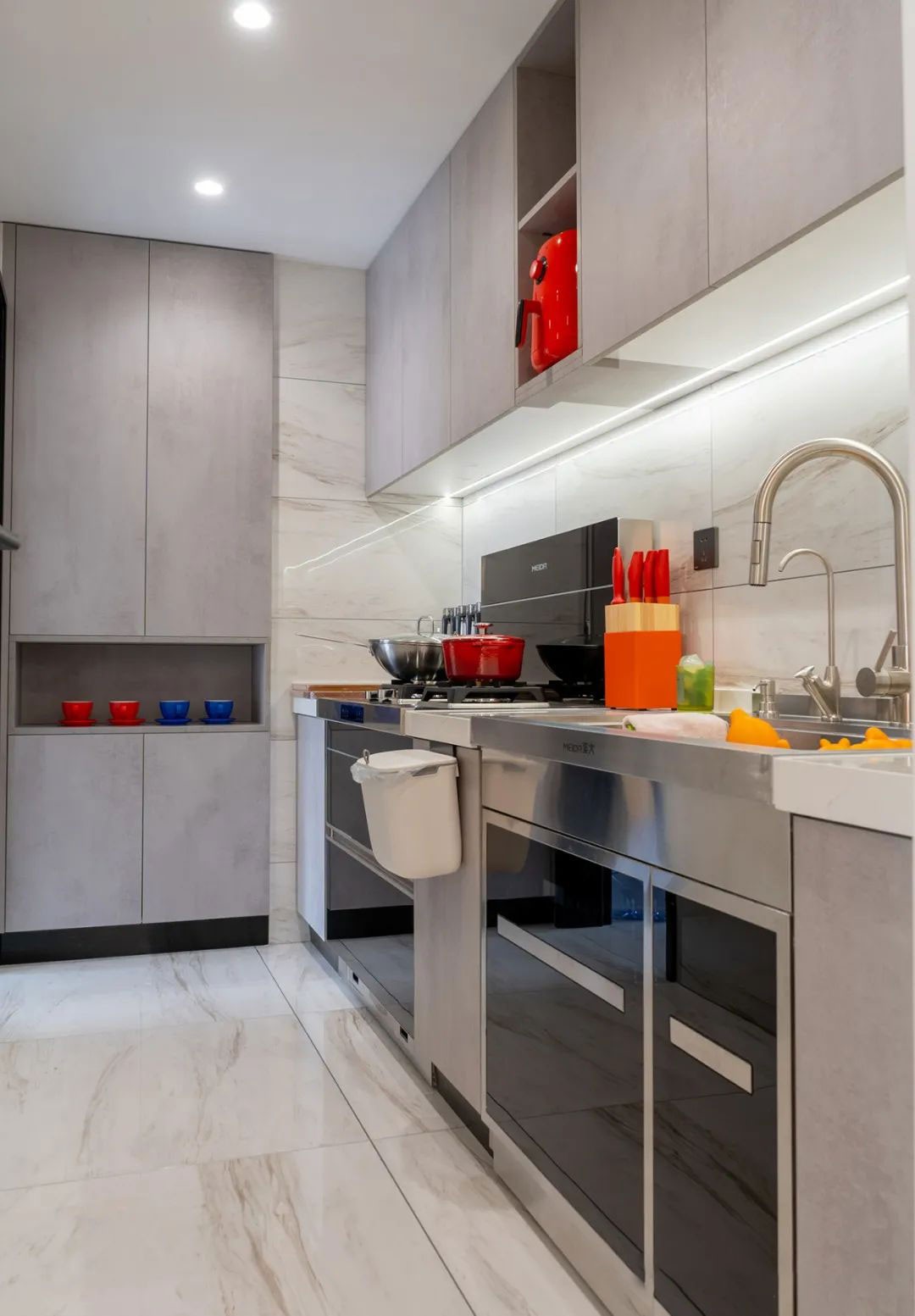 厨房蒸烤一体集成灶与灰色的柜体合二为一