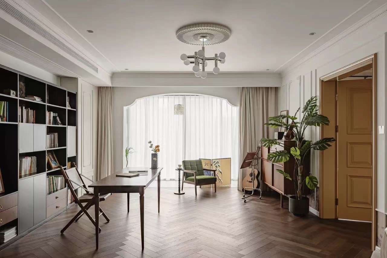 餐厨、客厅通铺人字拼木地板,但设计师给餐厨和客厅两种不一样的感觉。客厅是休闲娱乐和亲子互动区域,屋主会在这里***,陪孩子读书、做手工、看电影。我们选择深色系的桌椅书架,外加高挑的绿植,营造出浪漫慵懒的南洋度假风。 这一整面书柜储物自不用说,家长和孩子拢共近500本图书,均可立放收纳。家长的书在上层,孩子的书在下层,方便各自拿取。 屋主希望书架将封闭柜门与开放隔层结合,同时书架右侧便是父母房入口,