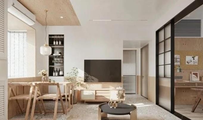 客厅的设计之中,围绕整个房间,打上了一圈枫木板墙裙,和玄关的天花板形成了视觉上的呼应。也奠定了原木风的全屋基调,整个家显得简单又自然。
