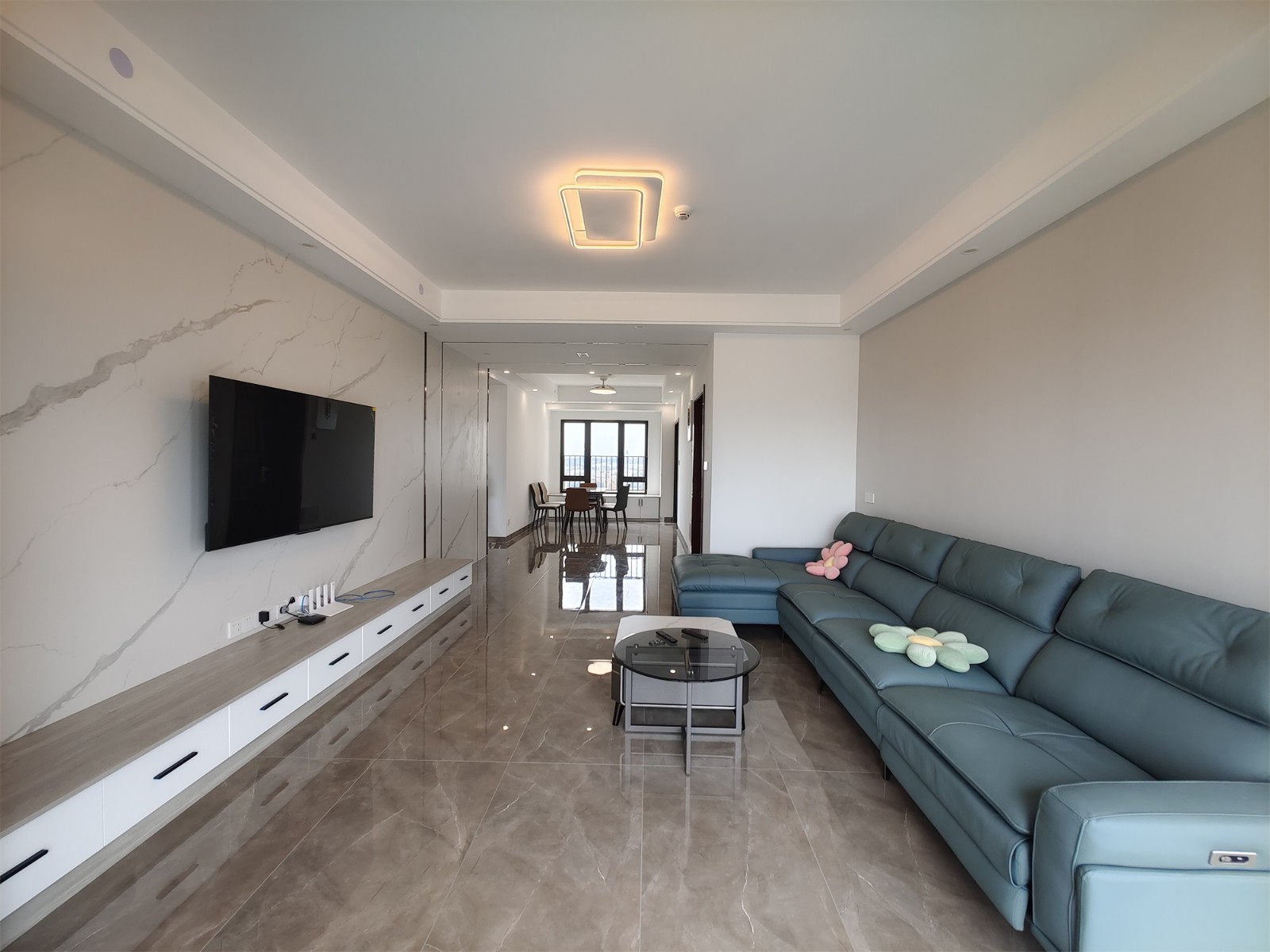 沙发墙留白,看起来十分的干净。低饱和度的孔雀绿转角沙发,起到点缀空间,平衡色彩的作用。