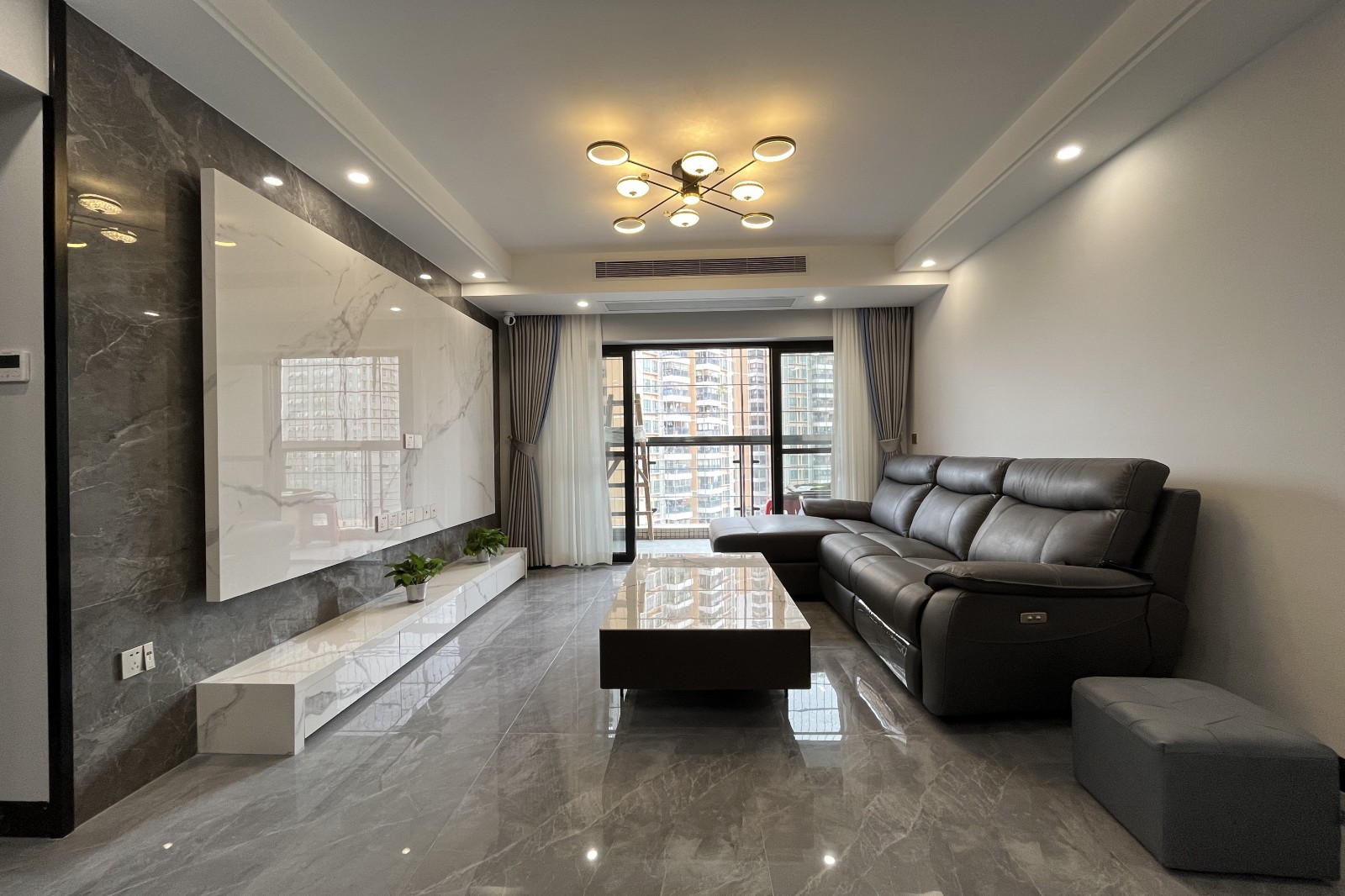 客厅,灰色地砖通铺延伸空间感,顶面1主灯+N筒灯设计满足不同生活场景,经典的黑白灰色调营造沉静内敛的氛围。
