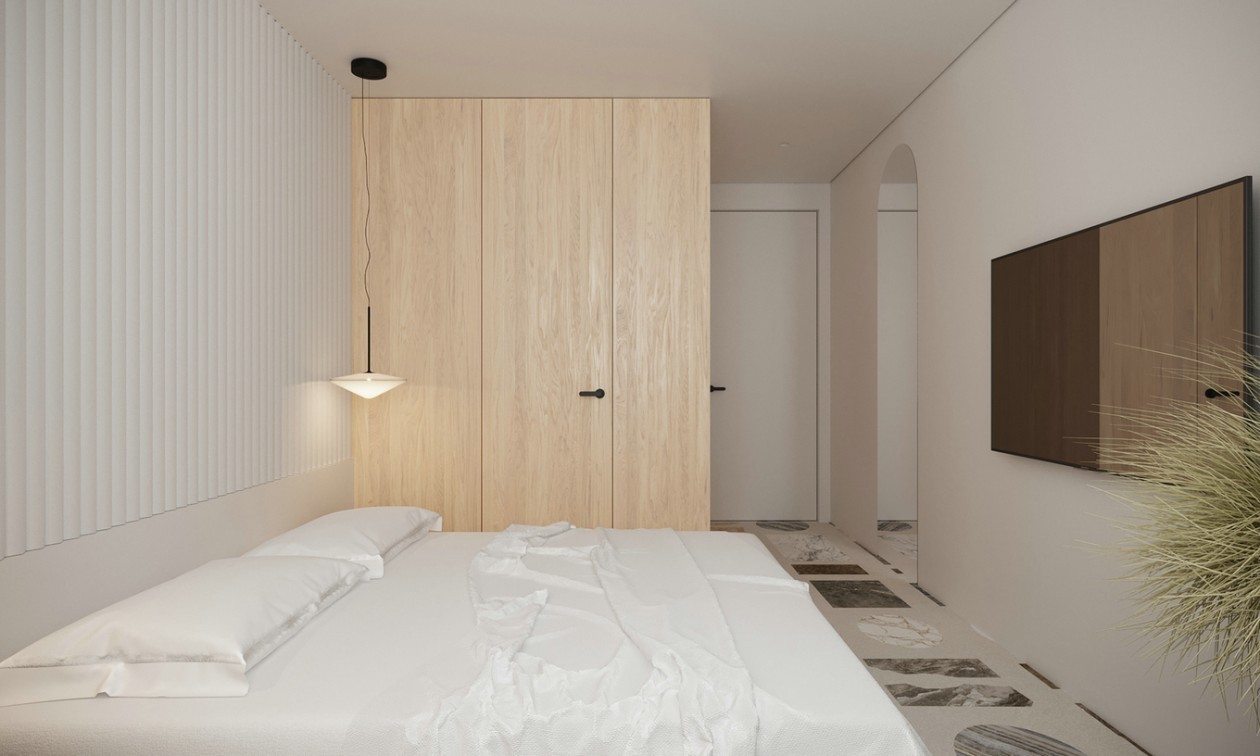 卧室以白色为主色调,整体营造出安静、休闲的氛围,电视墙也只做简洁的墙面。