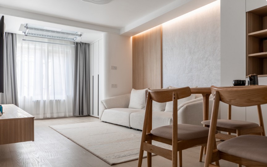 根据原始的房屋结构,客餐厅做开放式一体设计,光线进入室内后有更多发挥空间,搭配温暖的木质元素,奠定公区优雅清爽基调。奶油色软糯地毯进一步划分出沙发区,搭配同色系温柔沙发,夫妻两人在这里依偎着看电视、闲读,享受在家中的悠闲时光电视墙延续简约清爽的风格,下方的悬挑木质抽屉,作为电视区的收纳主力,同时也让电视墙在视觉上更有立体感。