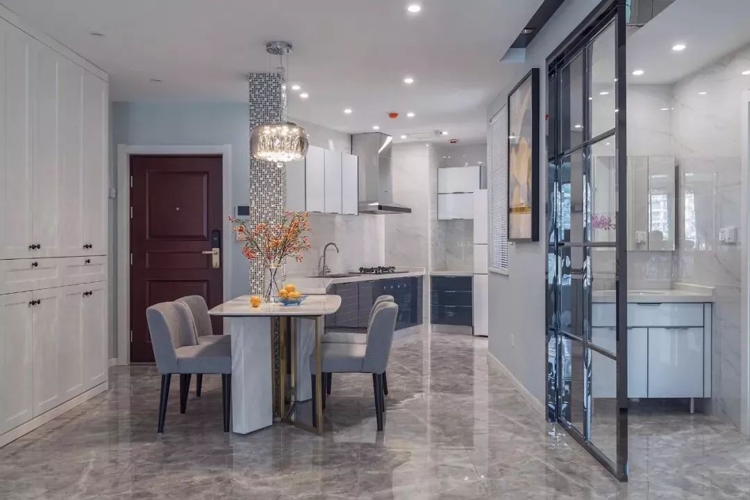 玄关与餐厅同处于一个区域,灰色大理石地砖显得十分大气有质感。白色入顶式玄关柜整洁干净,储物能力很强。