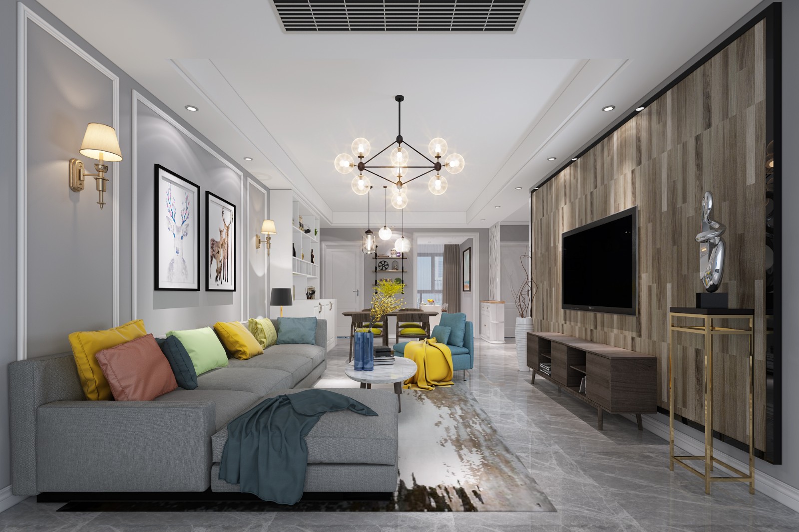 客餐厅:一眼看过去,风格已定,北欧风格,业主是一位医生,一直以来对北欧风格情有独钟,客厅的电视墙选择了地板上墙的形式,地面灰色大砖十分大气。