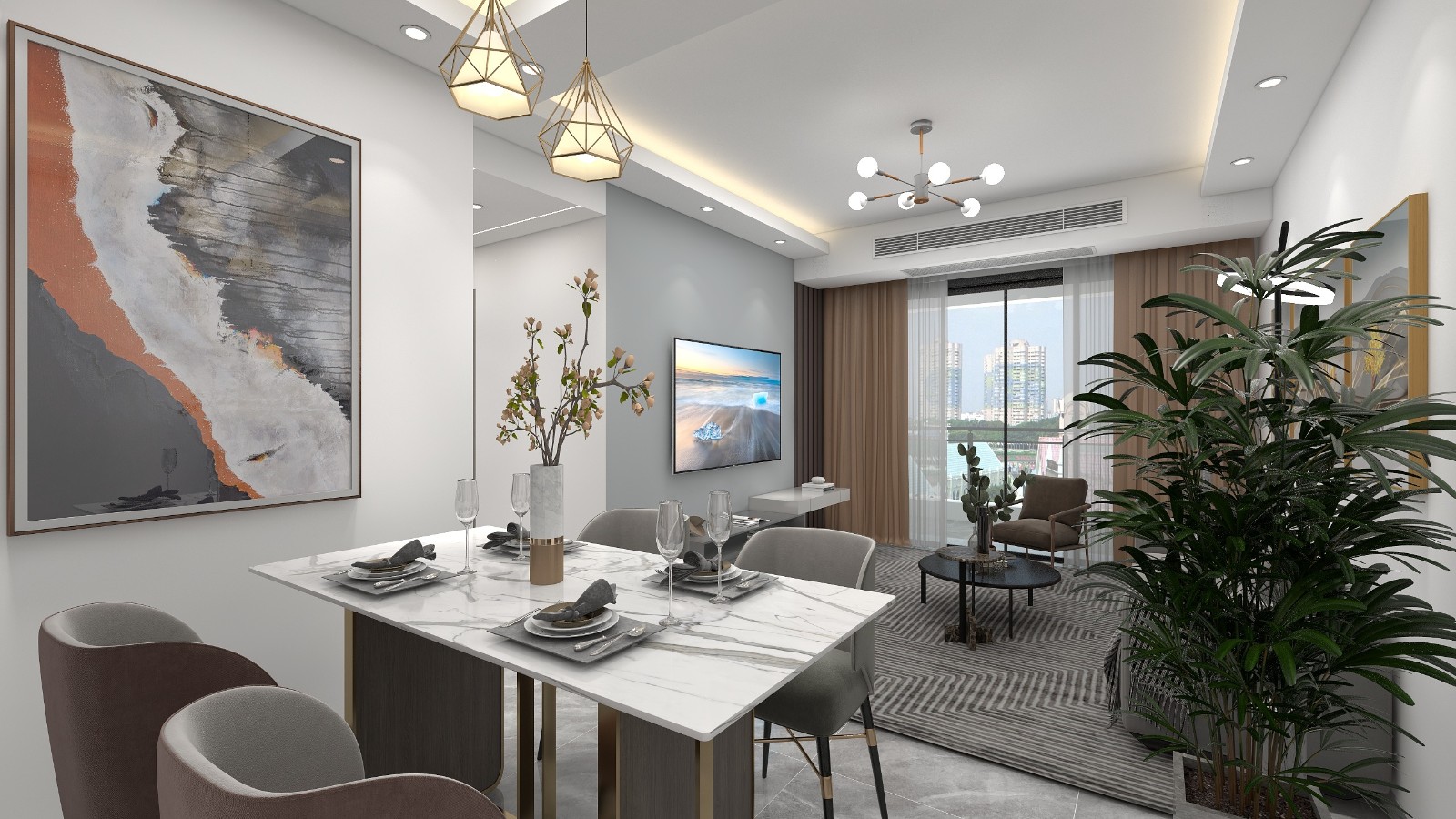 客餐厅空间整体以白为主色调,搭配上灰色的地砖与家私,营造出一个简单且淡雅的空间氛围,同时还给人一种时尚大方的视觉感受。