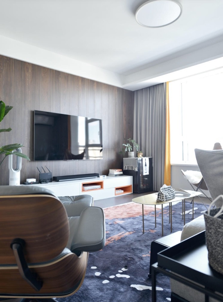 挂画和抱枕使得空间更加的活跃流动~~~~~~电视背景墙使用壁纸和黑色烤漆玻璃做的造型,竖向的壁纸纹理从视觉上拉伸了房高!