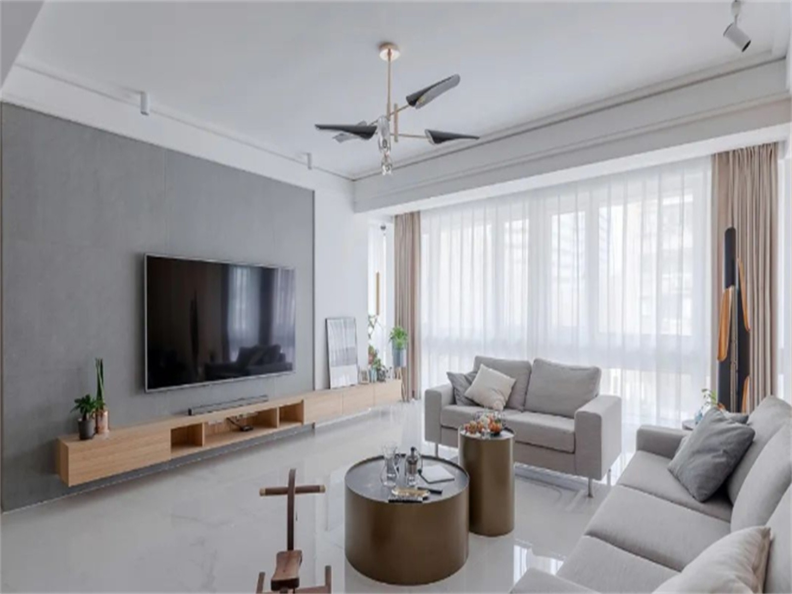 地面通铺白色石纹砖,灰色棉麻沙发来自北欧表情,木饰面背景提升整体温度