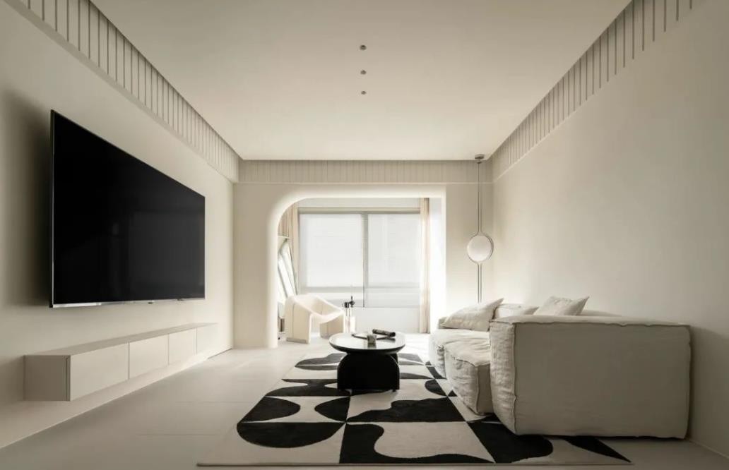 全屋墙面顶面用到的是有色乳胶漆 四周做了石膏板抽缝增加硬装的细节 电视背景墙用曲线造型缓和氛围 软装的挑选上面我们尽量用低饱和度的单品