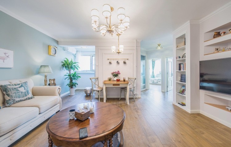 空间看上去开敞了太多,视听墙面把书柜,视听设备全部融入墙内,摒弃了厚重的 视听家具,让空间更加流畅,小宝宝更加安全。起居空间整体色调明快,清新