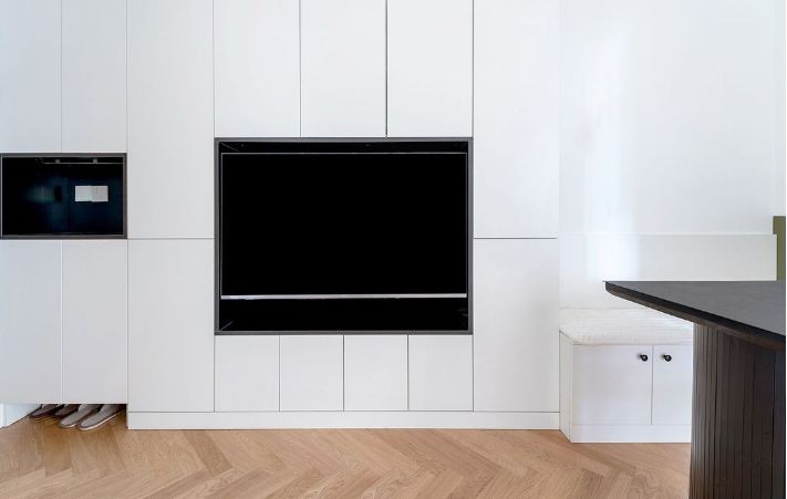 冰箱移至过道,与储物柜完美契合,释放出厨房空间,也不影响日常使用。