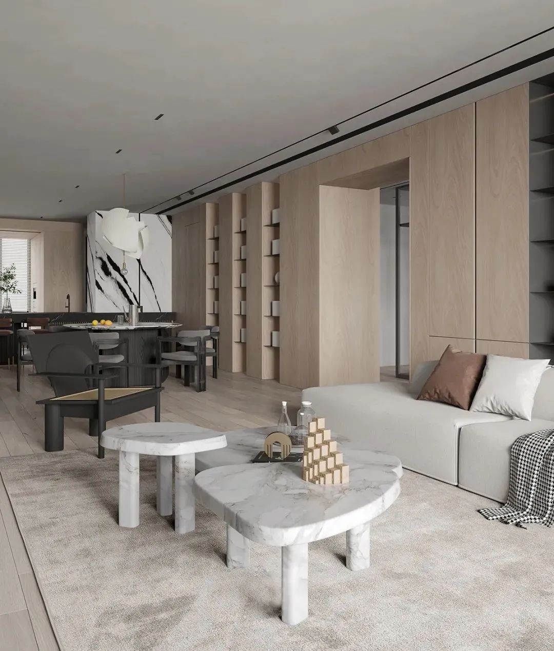 罗列空间模块再组合,巧用空间线面关系,丰富三维视觉美感的同时,亦是带有极富生活化的务实收纳功能,于玄关吊柜处、于客餐侧墙处,填以线条、格口的开放展览空间为实用功能加添艺术情致。